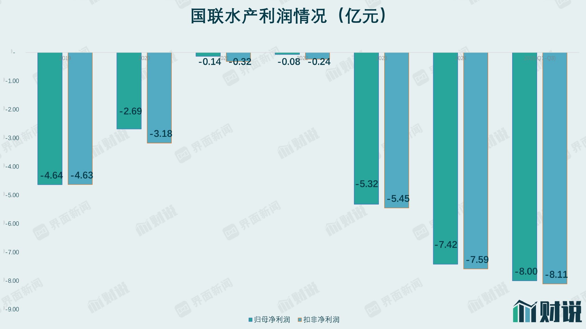 更令人担忧的是盈利状况。国联水产第三季度单季亏损高达2.59亿元,同比下降167.23%。累计来看,1-9月公司归母净利润为-8亿元,同比下降905.30%,亏损规模已超过2024年全年7.42亿元的亏损额。回溯其半年报可以发现,亏损扩大的趋势早有显现。2025年一季度公司尚实现602.84万元的正向净利润,但到半年报时已转为亏损5.40亿元,同比降幅高达3180.50%;扣非后净利润亏损5.51亿元,同比降幅更是飙升至22982.41%。值得注意的是,前三季度公司扣除非经常性损益后的净利润亏损8.11亿元,同比下降752.80%,与归母净利润降幅存在差异,主要因本期计入1275.43万元政府补助等非经常性收益,对冲了部分亏损。