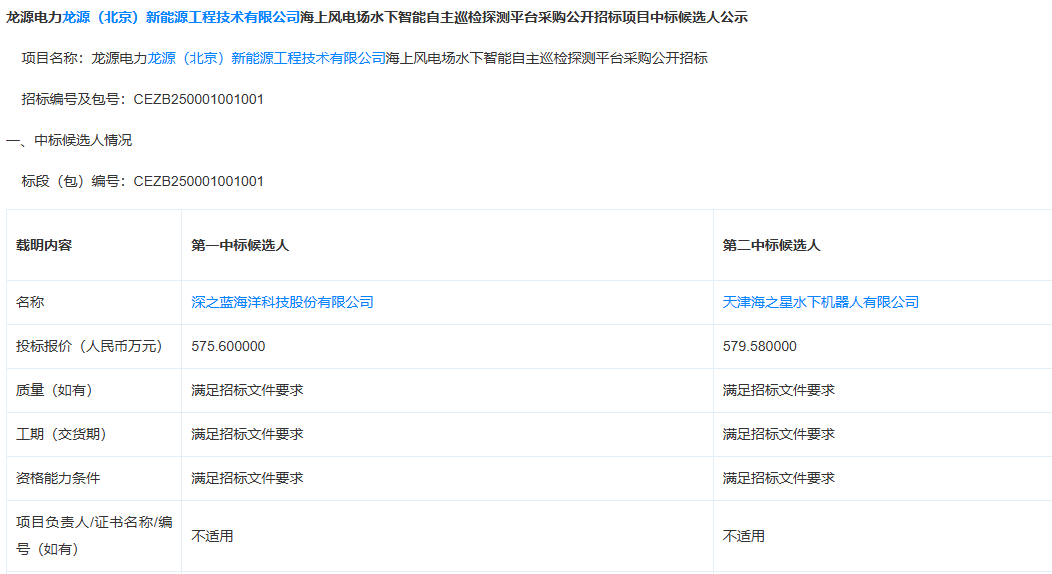 天眼查显示,天津海之星与深之蓝多次共同参与招投标活动,如2025年3月,龙源电力龙源(北京)新能源工程技术有限公司海上风电场水下智能自主巡检探测平台中,第一中标人为深之蓝,第二中标人为天津海之星,中标金额为575.6万元。