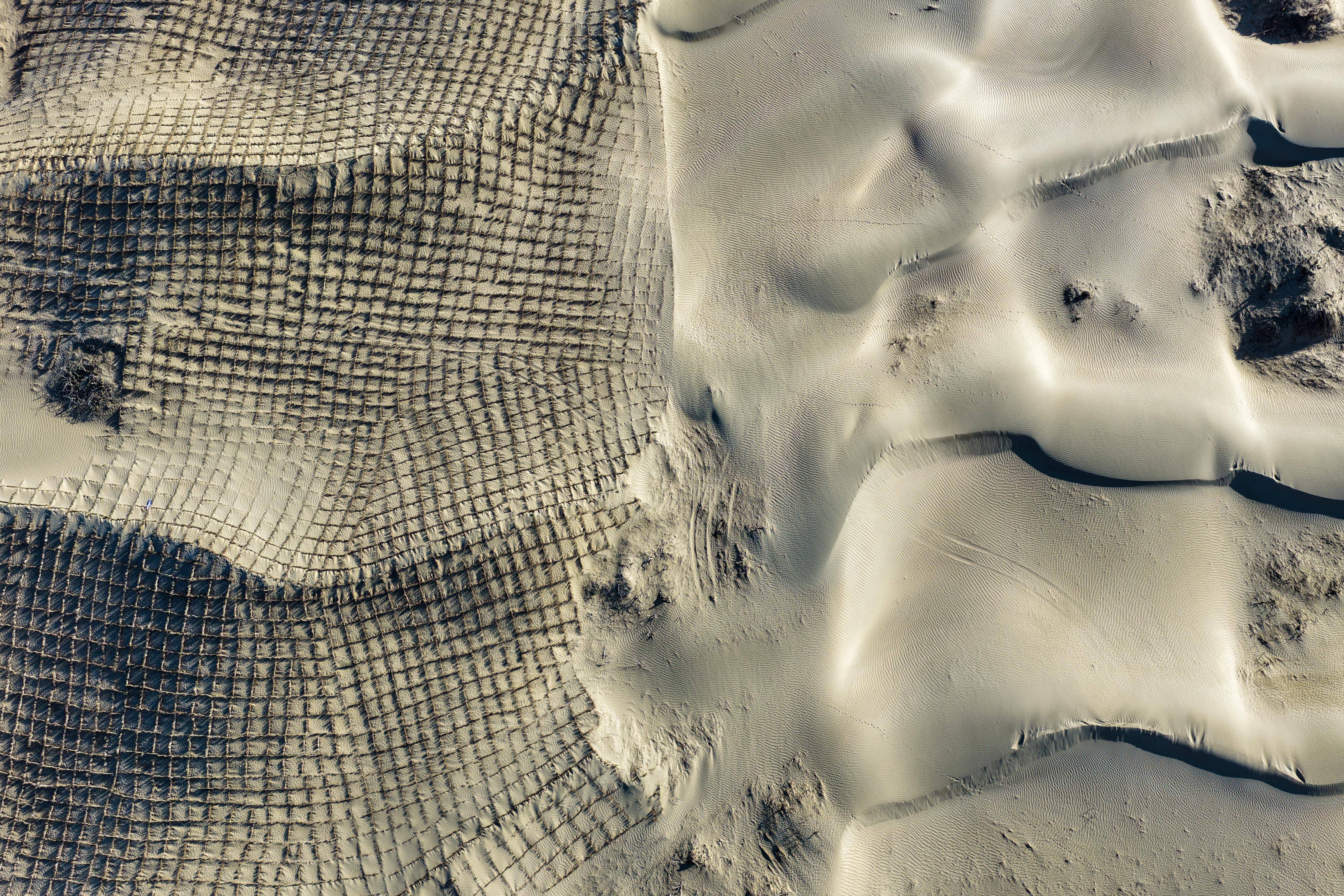 这是在新疆和田地区墨玉县喀瓦克乡周边沙漠拍摄的草方格(1月11日摄,无人机照片)。新华社记者 丁磊 摄墨玉县居民亚森·土尔地常来草方格铺设现场帮忙。他正使用特殊的铁锹将干芦苇扎进提前划好的网格中。