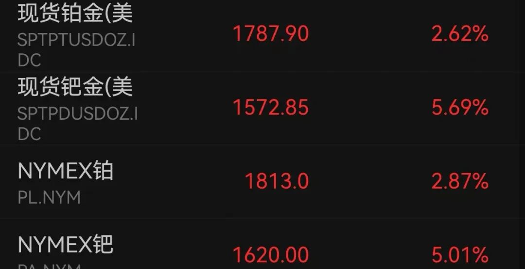 大宗商品方面,国际市场金、银、铜、铂、钯价格集体上涨,其中金价逼近历史新高,白银涨超3%,现货钯金涨超5%;原油价格承压下跌。