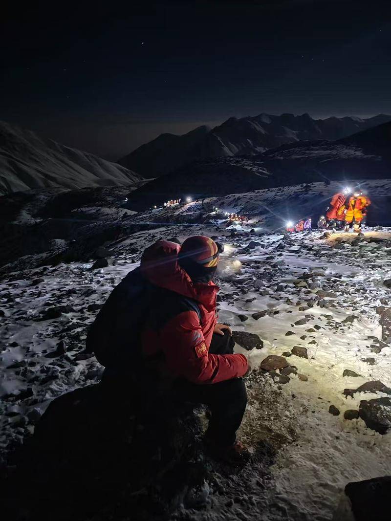 马文威带领着登山爱好者夜爬岗什卡雪峰。受访者供图